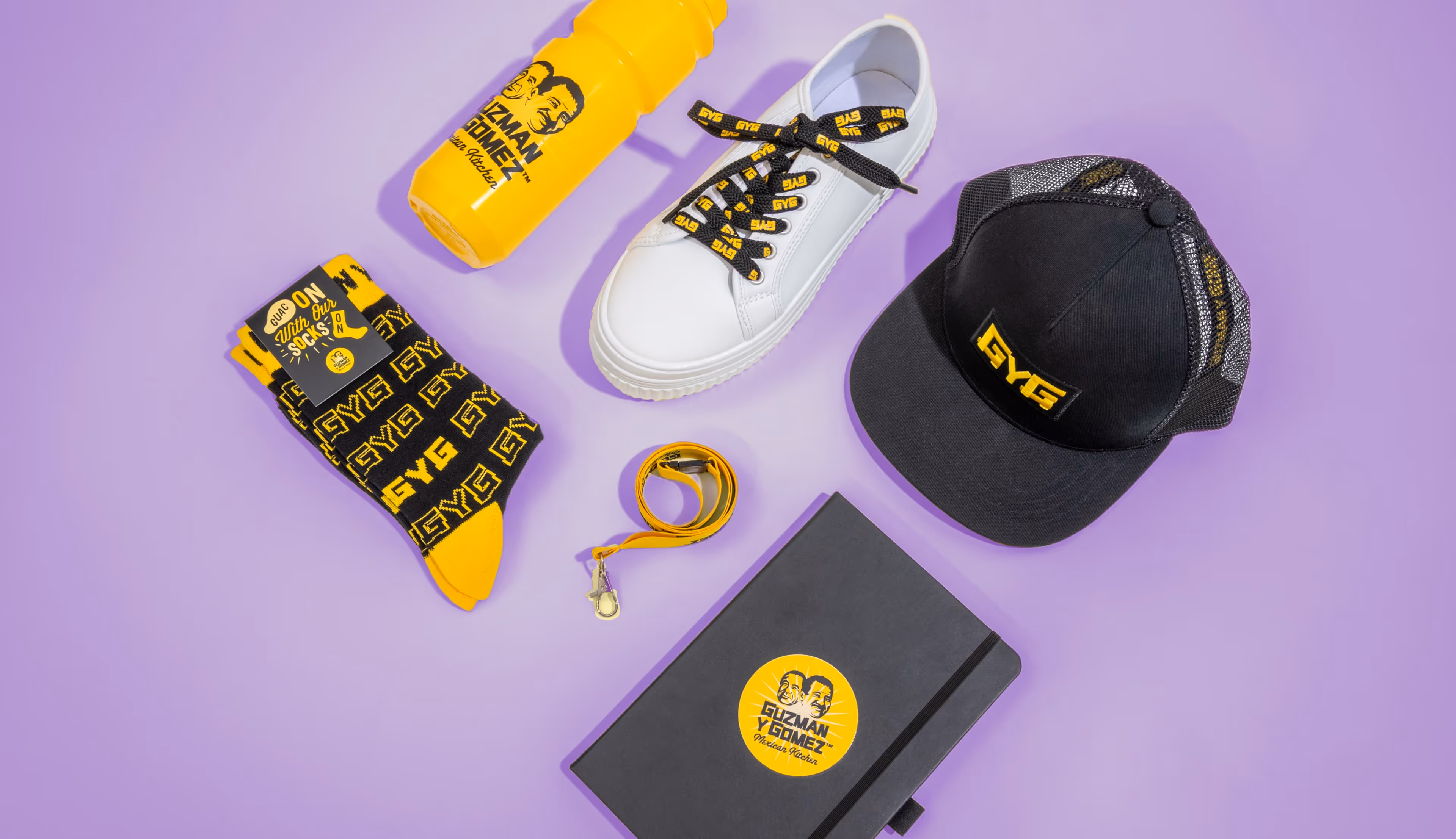 Bold, fun GYG merch that carries the brand’s lively culture. Durable pieces for everyday use in and out of store.